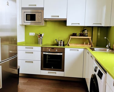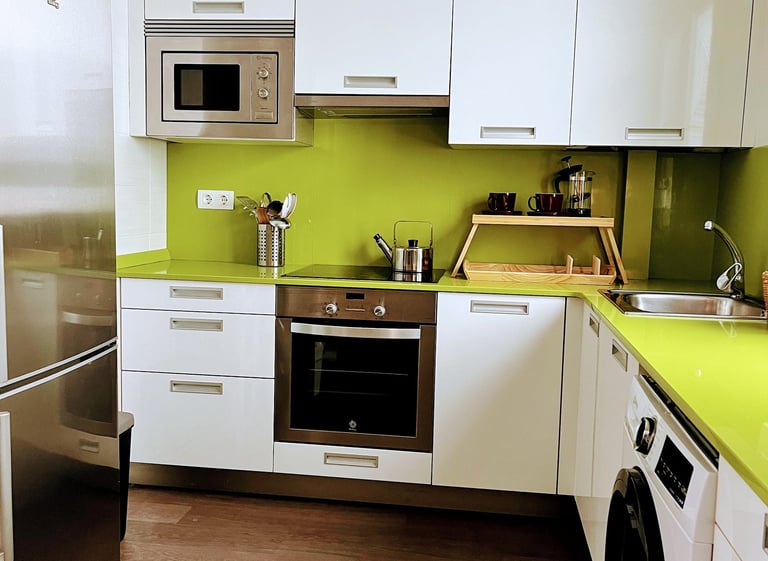 Cocina Moderna: Totalmente equipada con todos los electrodomésticos que necesitas, ¡incluyendo una excelente cafetera! La hemos abastecido con productos básicos, así que no tendrás que salir corriendo a comprar esenciales como la sal y la pimienta.