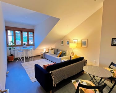 Sala de Estar Acogedora: Relájate en la espaciosa sala de estar, equipada con un gran sofá cama, televisión y conexión rápida a internet por fibra óptica, perfecta para trabajar o descansar. La sala de estar ofrece vistas a un encantador plaza arbolada y a una pintoresca iglesia, con campanas que suenan sobre el paisaje circundante.